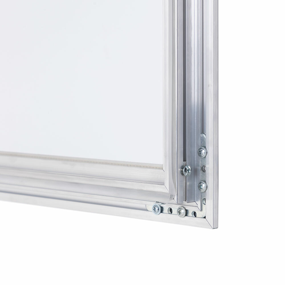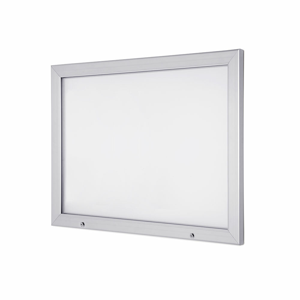 Die schlanke Konstruktion weist eine Außentiefe von 3,3 cm und eine Innentiefe von 1,2 cm auf. Die Tür besteht aus einem stabilen Aluminiumrahmen mit einer 3 mm starken PETG-Kunststoffplatte, die bruchsicher und UV-beständig ist und eine klare Sicht auf den Inhalt ermöglicht.