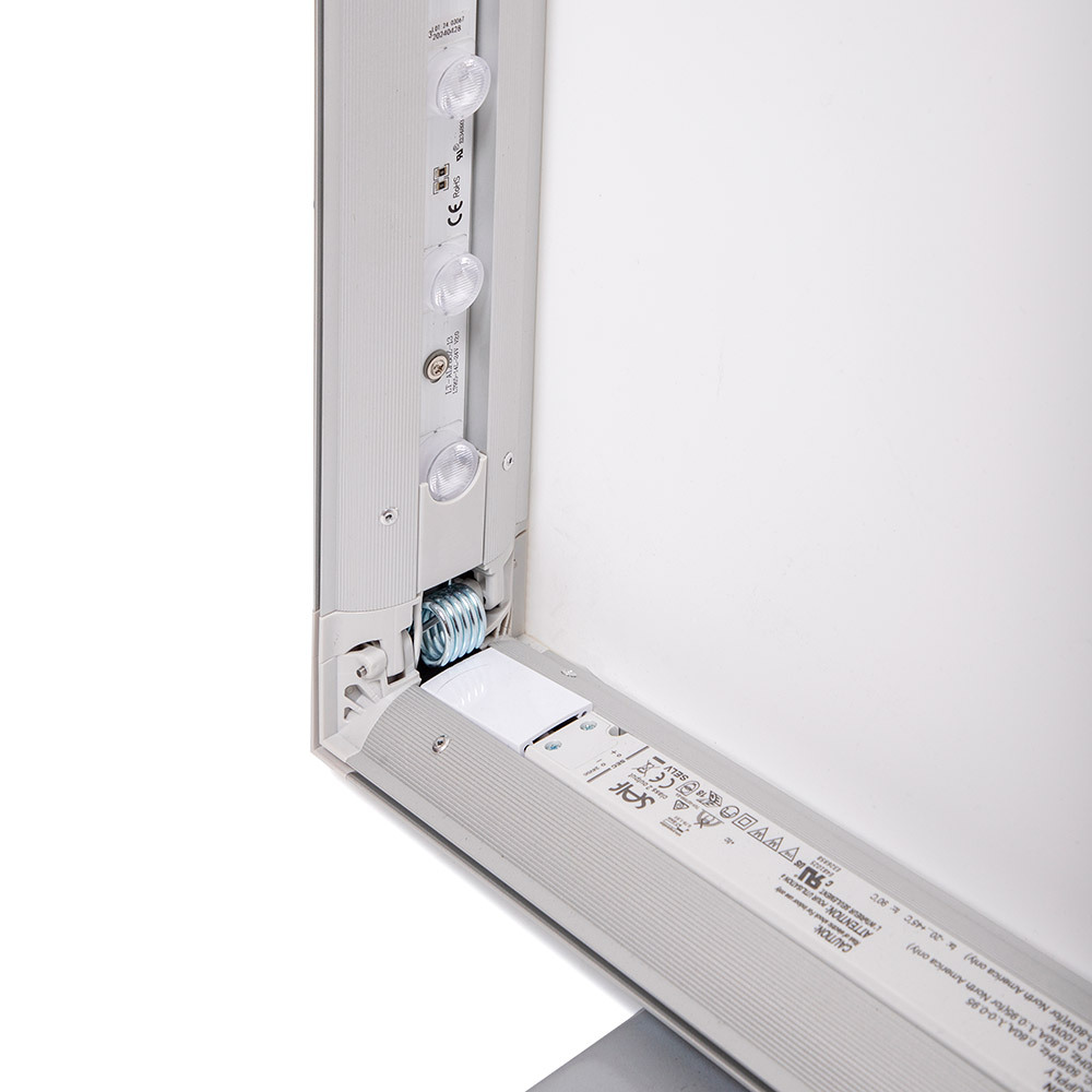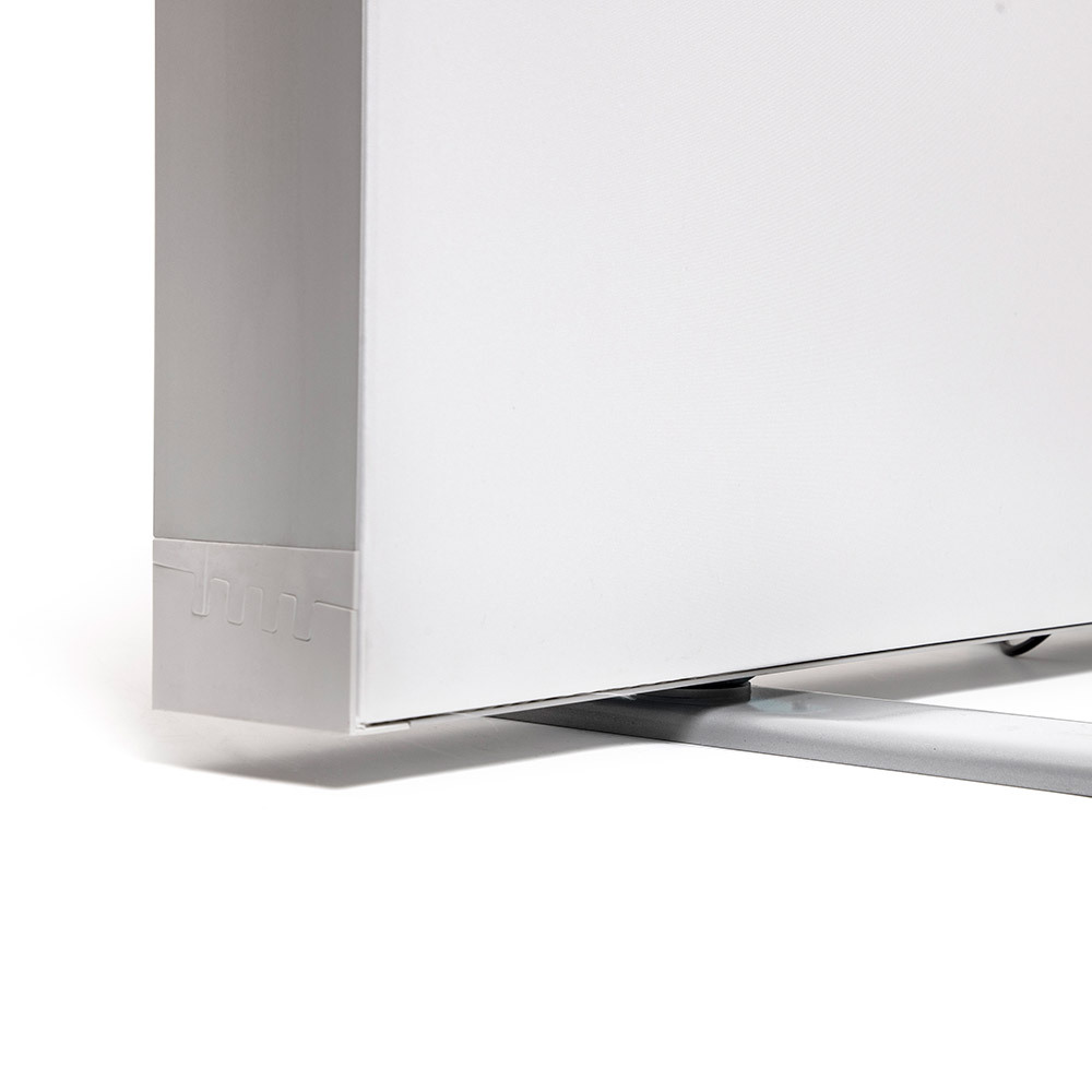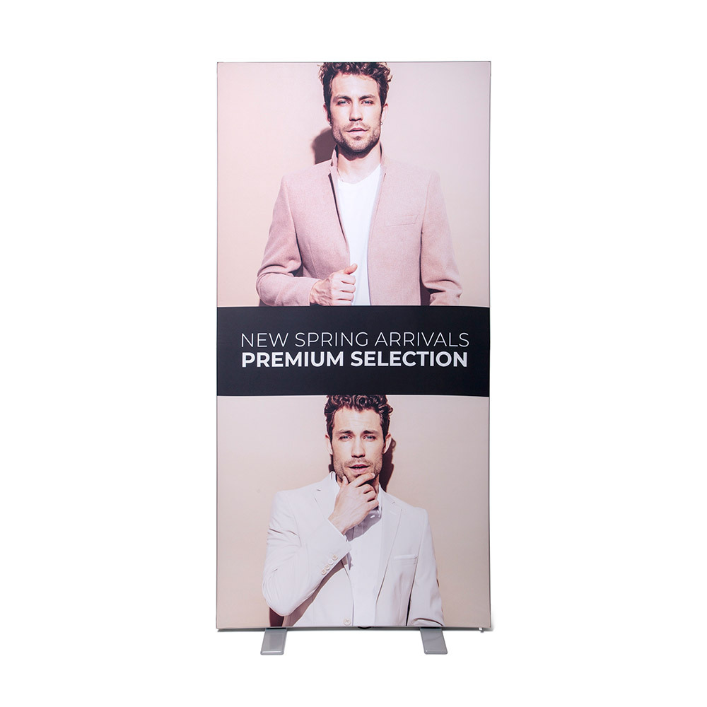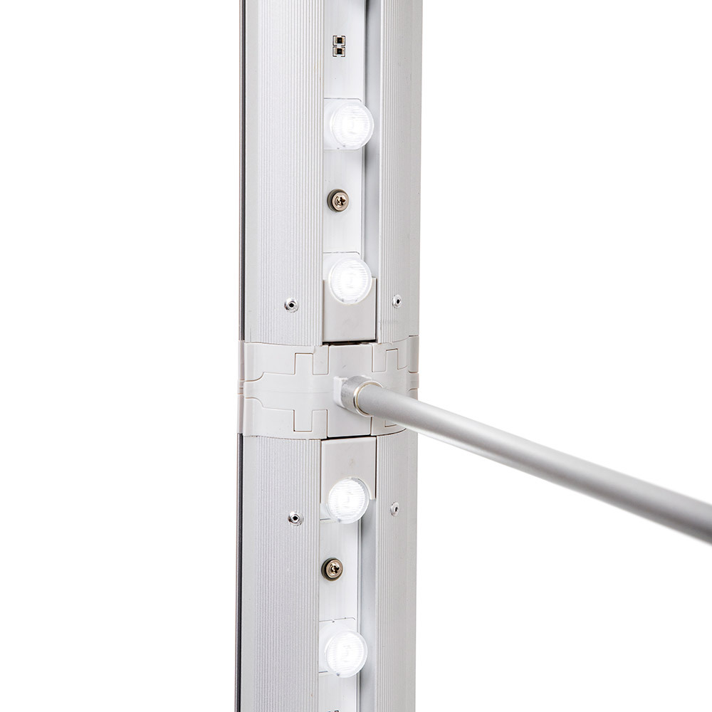 Die Konstruktion ermöglicht einen extrem schnellen Aufbau: Nach dem Entnehmen aus der Tasche lässt sich das System in wenigen Handgriffen aufstellen. Die Mittelstange wird eingeklickt und die Grafik mittels Silikonrand befestigt. Eine besondere Stärke liegt in der doppelseitigen LED-Beleuchtung, die eine starke Sichtbarkeit garantiert.