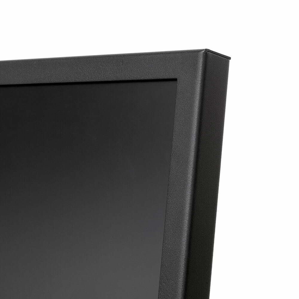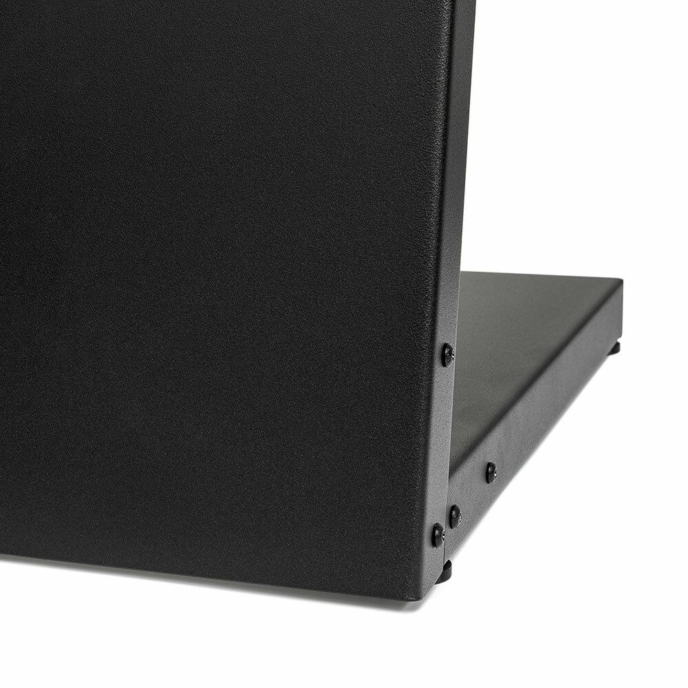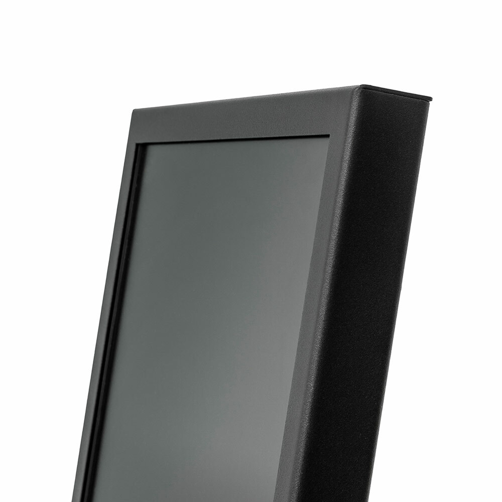Die hochwertige Konstruktion aus leichtem Stahl überzeugt durch ein schlankes, minimalistisches Design mit feinstrukturierter schwarzer Pulverbeschichtung. Trotz des geringen Gewichts bietet das Display eine bemerkenswerte Stabilität und ein elegantes Erscheinungsbild, das sich nahtlos in verschiedene Unternehmensumgebungen integrieren lässt.