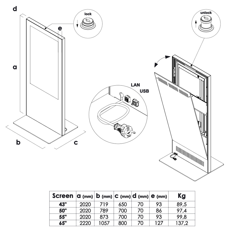 Die digitale Werbestele überzeugt durch ihr schlankes Design und konzentriert die Aufmerksamkeit vollständig auf die zentrale Werbebotschaft. Mit einer Höhe von 2.020 mm und einer Breite von 789 mm eignet sie sich ideal für kompakte Präsentationsflächen wie Messeauftritte oder Geschäftseingänge.