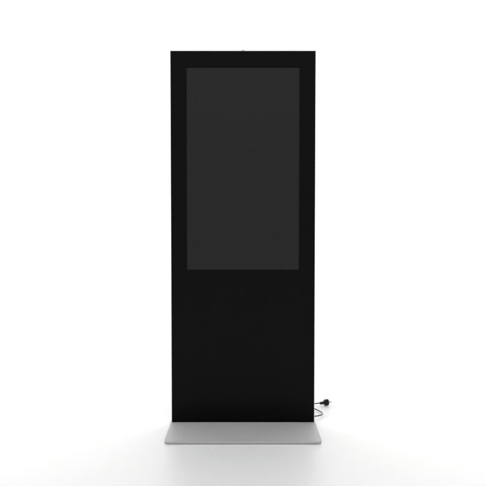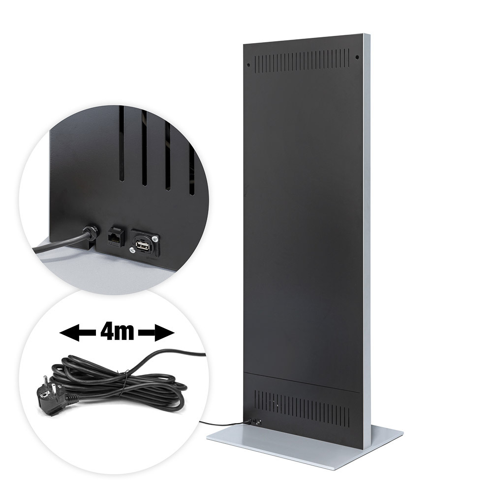 Die digitale Werbestele überzeugt durch ihr schlankes Design und ermöglicht eine gezielte Präsentation von Werbebotschaften an stark frequentierten Orten wie Messen oder im Einzelhandel. Der Bildschirm ist durch eine Frontseite aus gehärtetem Sicherheitsglas optimal geschützt und garantiert somit eine hohe Widerstandsfähigkeit gegen äußere Einflüsse.