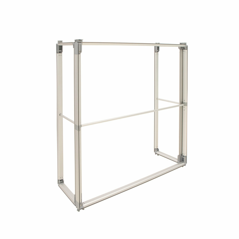 Das System überzeugt durch seine Modularität: Es kann für ein- oder doppelseitige Grafiken genutzt werden und lässt sich mit verschiedenen Elementen wie Erweiterungssets, Dachmodulen oder Thekenbereichen kombinieren. Die maximale Aufbauhöhe beträgt 250 cm, wodurch sich vielfältige Präsentationslösungen realisieren lassen.