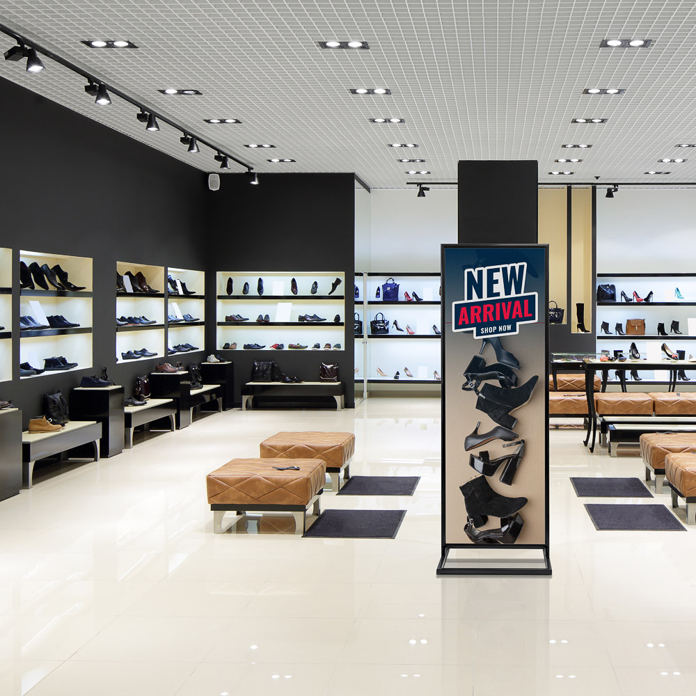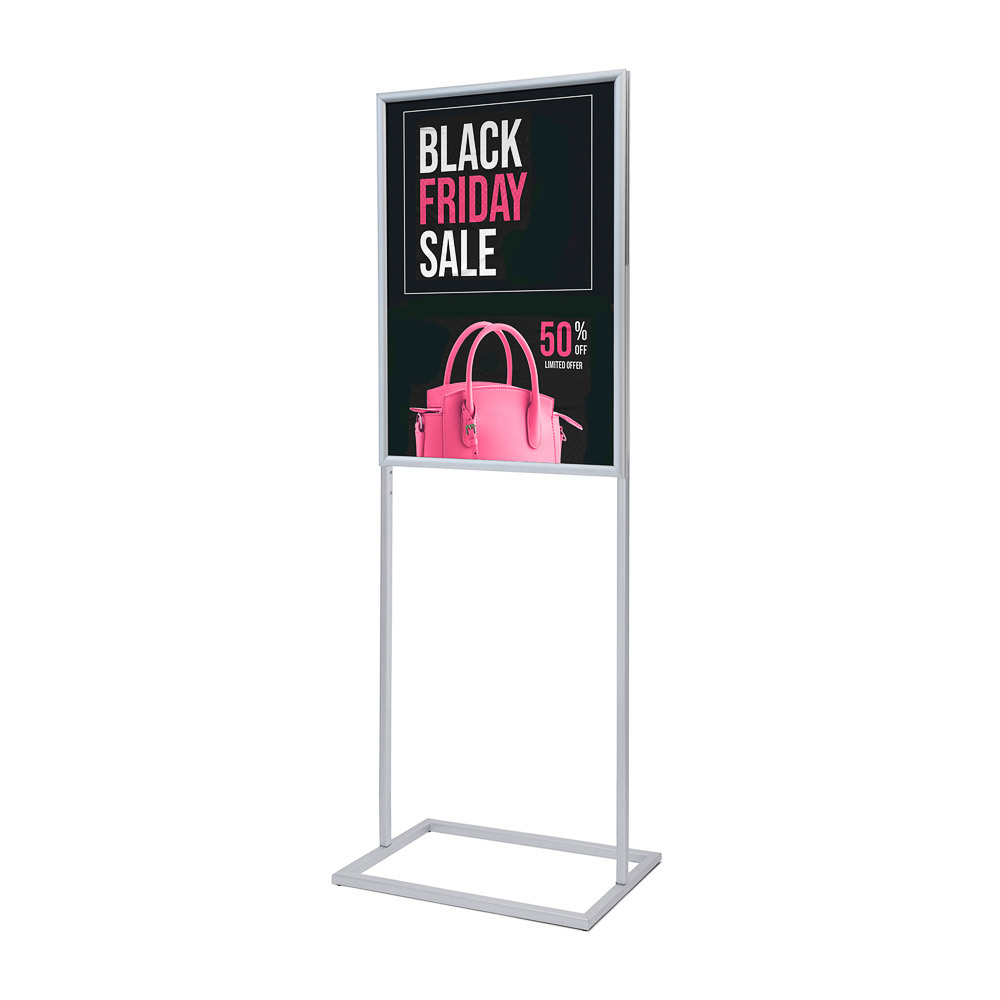 Die vollständig aus Aluminium gefertigte Konstruktion garantiert eine außerordentliche Stabilität und zeitlose Eleganz. In den Farbvarianten Silber und Schwarz adaptiert sich das Display harmonisch an verschiedenste Unternehmensumgebungen wie Einzelhandel, Ausstellungsräume oder repräsentative Empfangsbereiche.