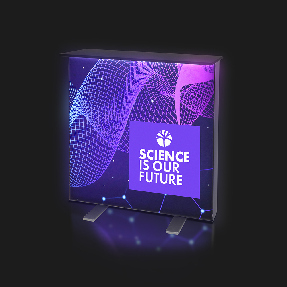 In Silber gehalten, bietet der Brightbox Counter eine sichtbare Fläche von 1000 x 1000 mm. Mit einer Gesamthöhe von 1030 mm und einer Tiefe von 400 mm schafft er einen prägnanten Messeauftritt. Die integrierte Stromversorgung mit 45 W Leistung und einer Kabellänge von 3,85 m ermöglicht eine flexible Positionierung.