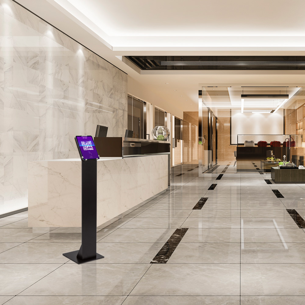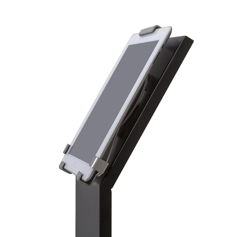Das Standardmodell in Schwarz lässt sich durch verschiedene Farboptionen individuell anpassen. Der Tabletständer ist ideal für Präsentationszwecke, Informationsstationen oder interaktive Kundenservicebereiche. Die abschließbare Konstruktion bietet zusätzliche Sicherheit für wertvolle Geräte.