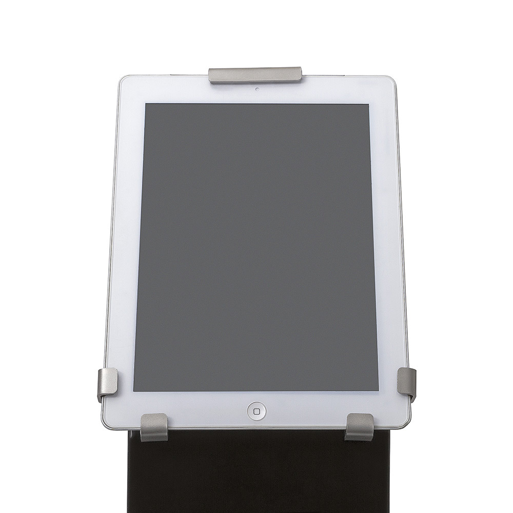 Der Ständer bietet maximale Flexibilität durch die Nutzungsmöglichkeit im Hoch- und Querformat. Der integrierte Trigrip-Mechanismus garantiert eine sichere Halterung des Tablets und verhindert unbeabsichtigtes Herunterfallen. Der Stahlrahmen eignet sich hervorragend für individuelle Branding-Optionen wie Siebdruck oder Klebefolien.